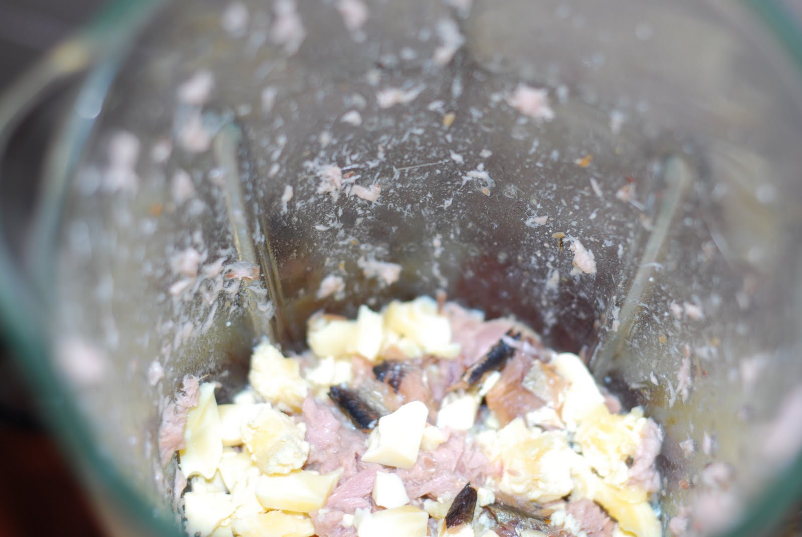 9. am pus in blender tonul, sprotii bucatiti, zeama de la jumatate de lamaie, de fapt toate ingredinetele si am blenduit cu spor pana a rezultat o pasta, adaugand din cand in cand zeama din peste ca sa omogenizez.